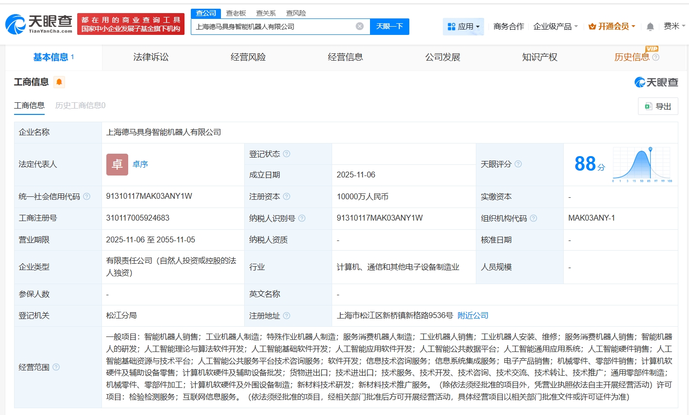 天眼查工商信息显示,11月6日,上海德马具身智能机器人有限公司成立,法定代表人为卓序,注册资本1亿人民币,经营范围包括智能机器人销售、工业机器人制造、特殊作业机器人制造等。股东信息显示,该公司由德马科技(688360)全资持股。