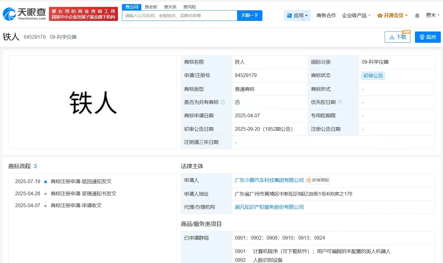 天眼查知识产权信息显示,今年4月,广东小鹏汽车科技集团有限公司申请注册“铁人”商标,国际分类为科学仪器,当前商标状态为初审公告。