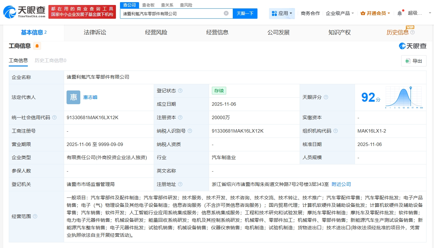 天眼查App显示,近日,诸暨利氪汽车零部件有限公司成立,法定代表人为惠志峰,注册资本2亿,经营范围包括汽车零部件及配件制造、汽车零部件研发、汽车零配件零售等。股东信息显示,该公司由利氪(浙江)科技有限公司全资持股。
